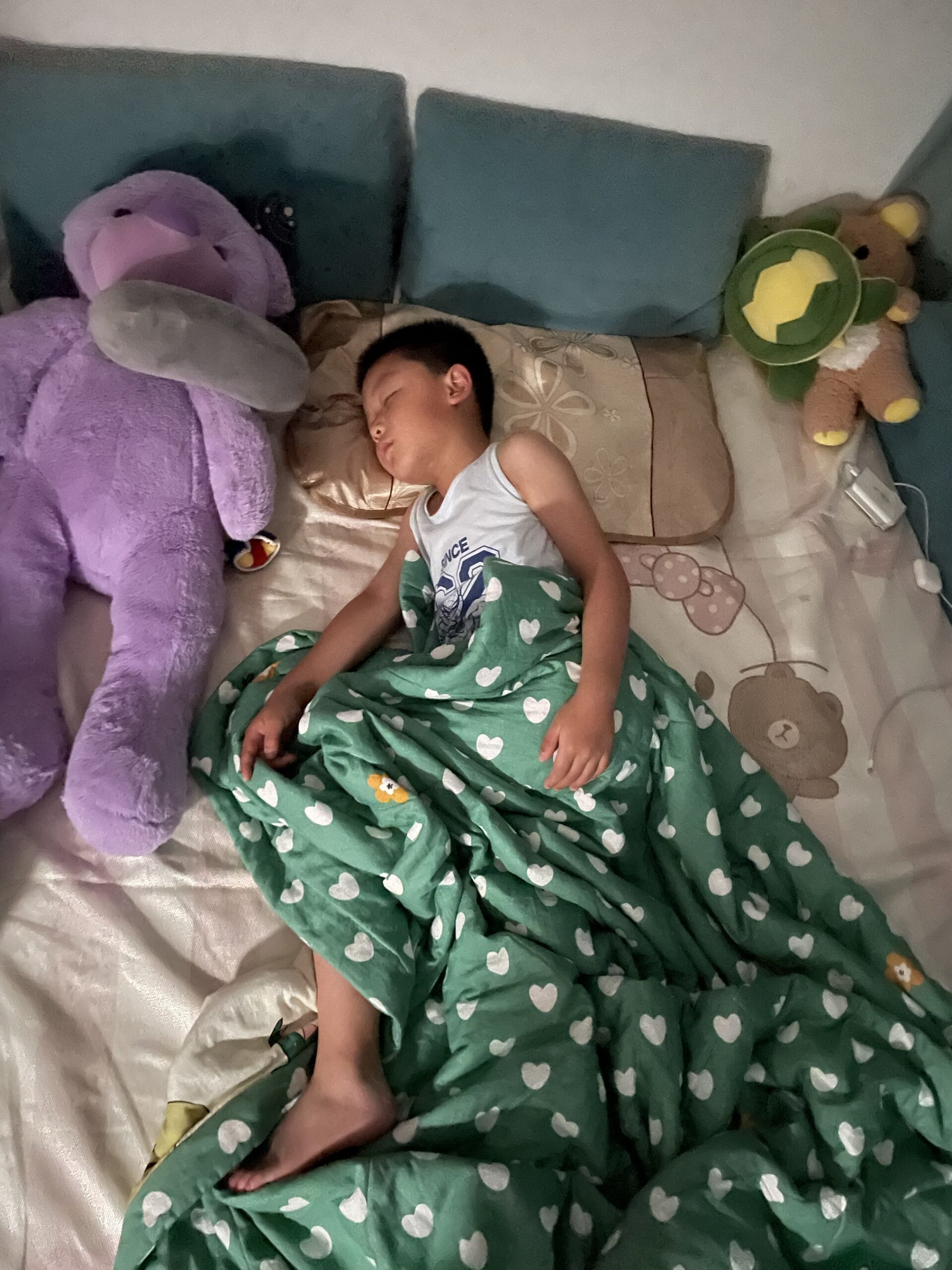 把小朋友的房间整理了一下,床铺好,让他自己单独睡,已经连续第三天睡在自己房间了,不过还是要我陪着。