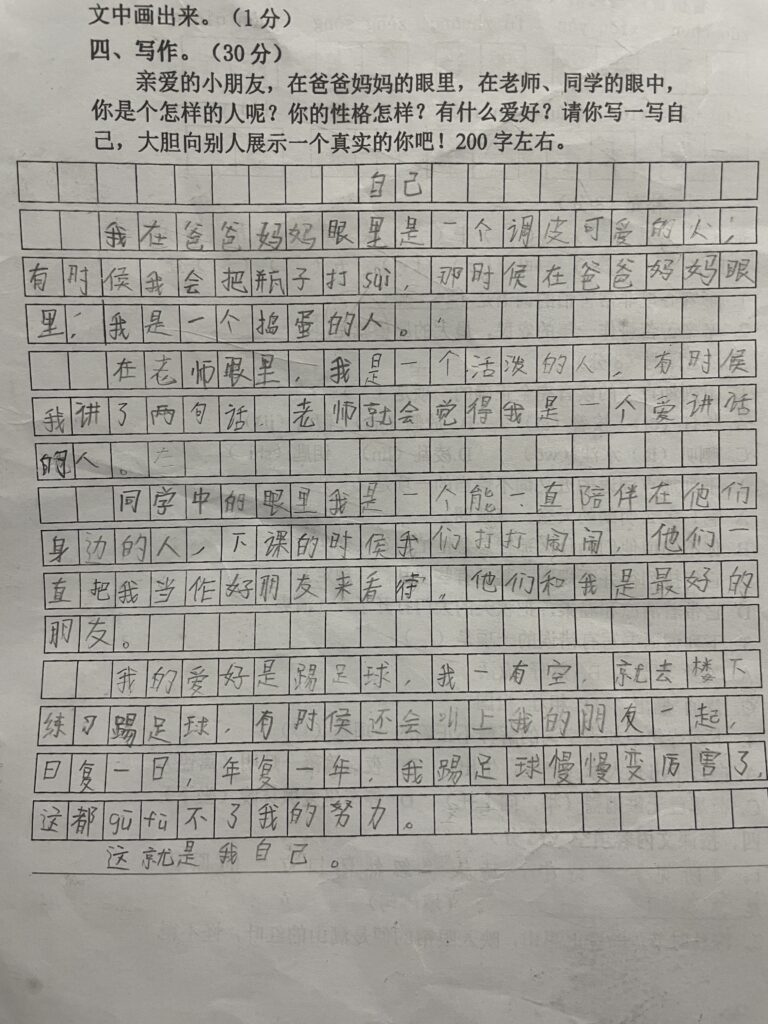 这是兜兜同学上周练习里面的作文,三年级了,开始写作文,比二年级的看图写话难度加大,我一度很担心他会向我一样不善于表达,而且有这种迹象,这让我很担心。